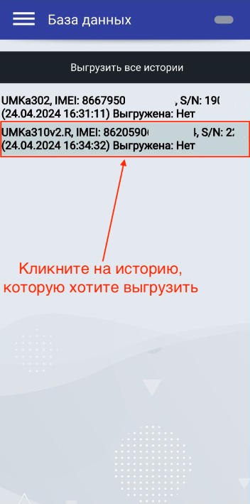 Если вы хотите выгрузить историю одного терминала, а не всех сразу, в разделе "База данных" найдите и кликните нужную вам историю.